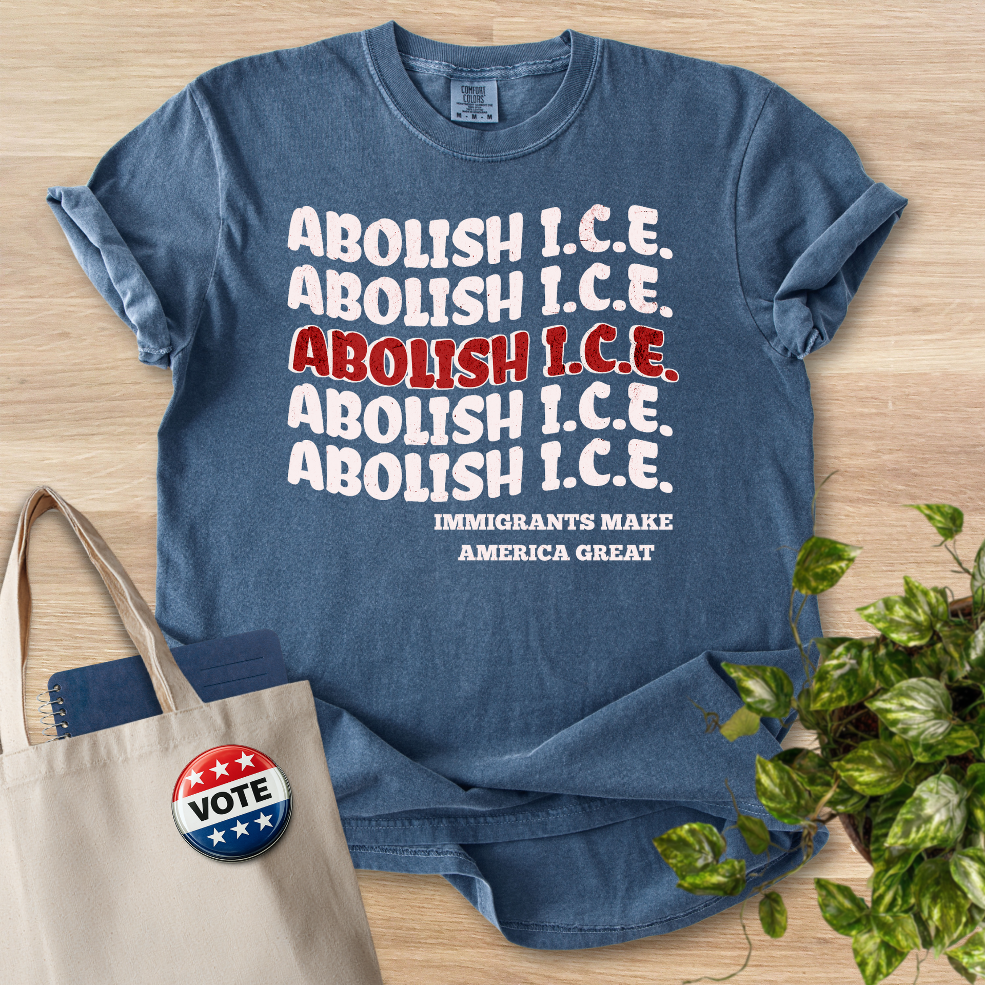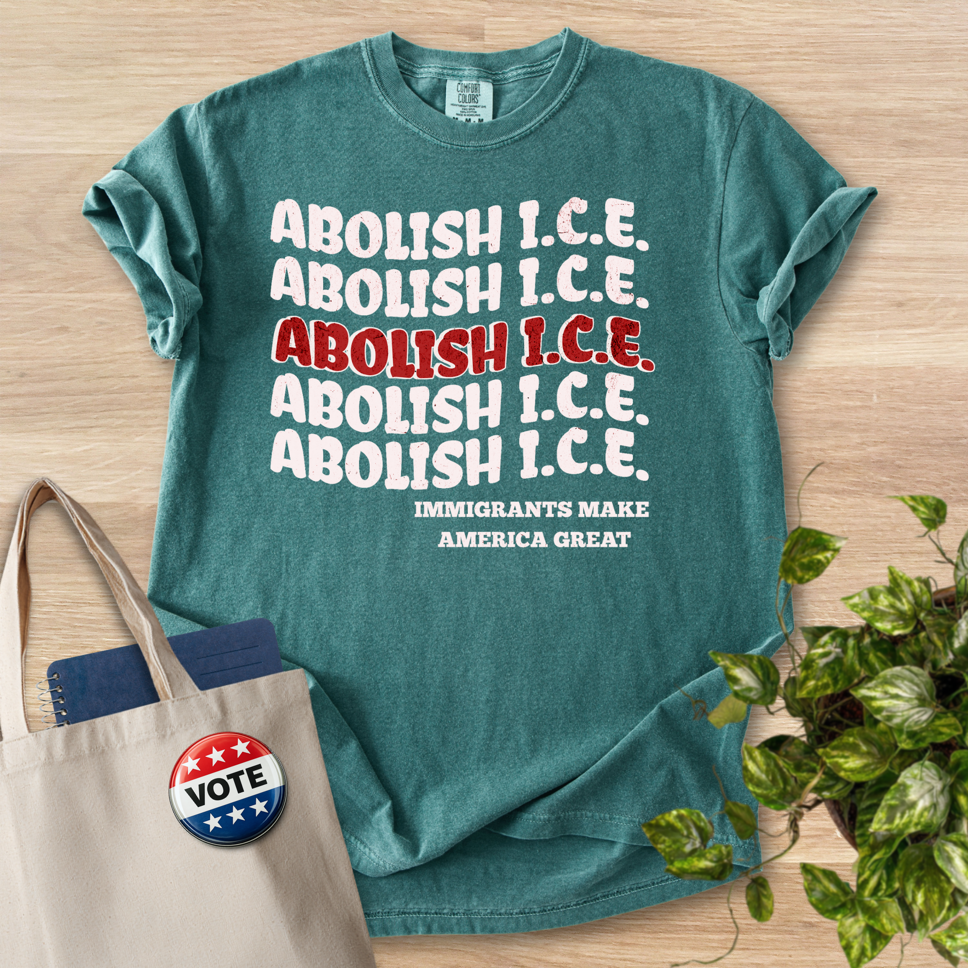 This heavyweight garment-dyed tee carries a clear, activist voice while remaining soft and lived-in from the first wear. Printed across the chest is a bold, repeating slogan with one line emphasized in red, and a smaller supportive message beneath — a design meant to start conversations and stand with immigrant communities. The relaxed fit and substantial 6.1 oz cotton give it presence without stiffness. Wear it to rallies, community meetings, or on days when you want your values visible; it layers easily under jackets or stands alone as a statement piece. The garment-dyed finish gives each shirt subtle color depth and a well-worn feel that ages gracefully, while the tubular knit and double-needle stitching keep it durable through repeated wear and washes.