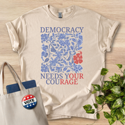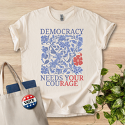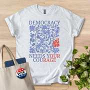 This relaxed-fit tee speaks softly but firmly. A block of delicate blue florals surrounds a bold message: “DEMOCRACY NEEDS YOUR COURAGE,” with a single red bloom that draws the eye. The shirt sits light and airy on the body, its crew neck and classic cut making it effortless to layer under a jacket or wear alone while you walk, volunteer, or gather with friends. Wear it to conversations, canvasses, rallies, or low-key meetups — it reads like a calm call to action, not a slogan. The print’s mix of botanical detail and clear typography gives the shirt an artful, thoughtful feel that matches people who care about civic life and want to express that commitment in everyday outfits.