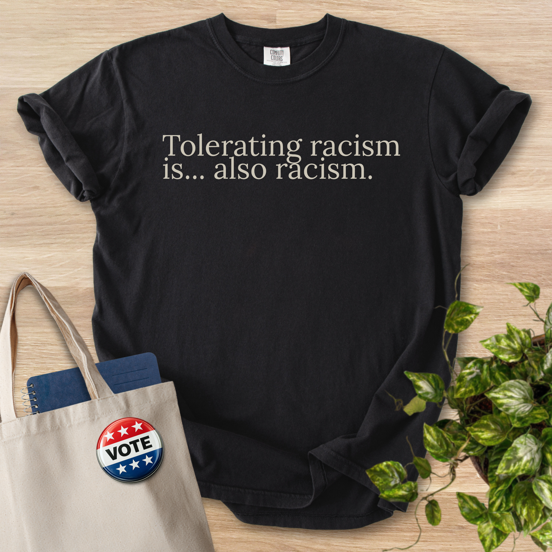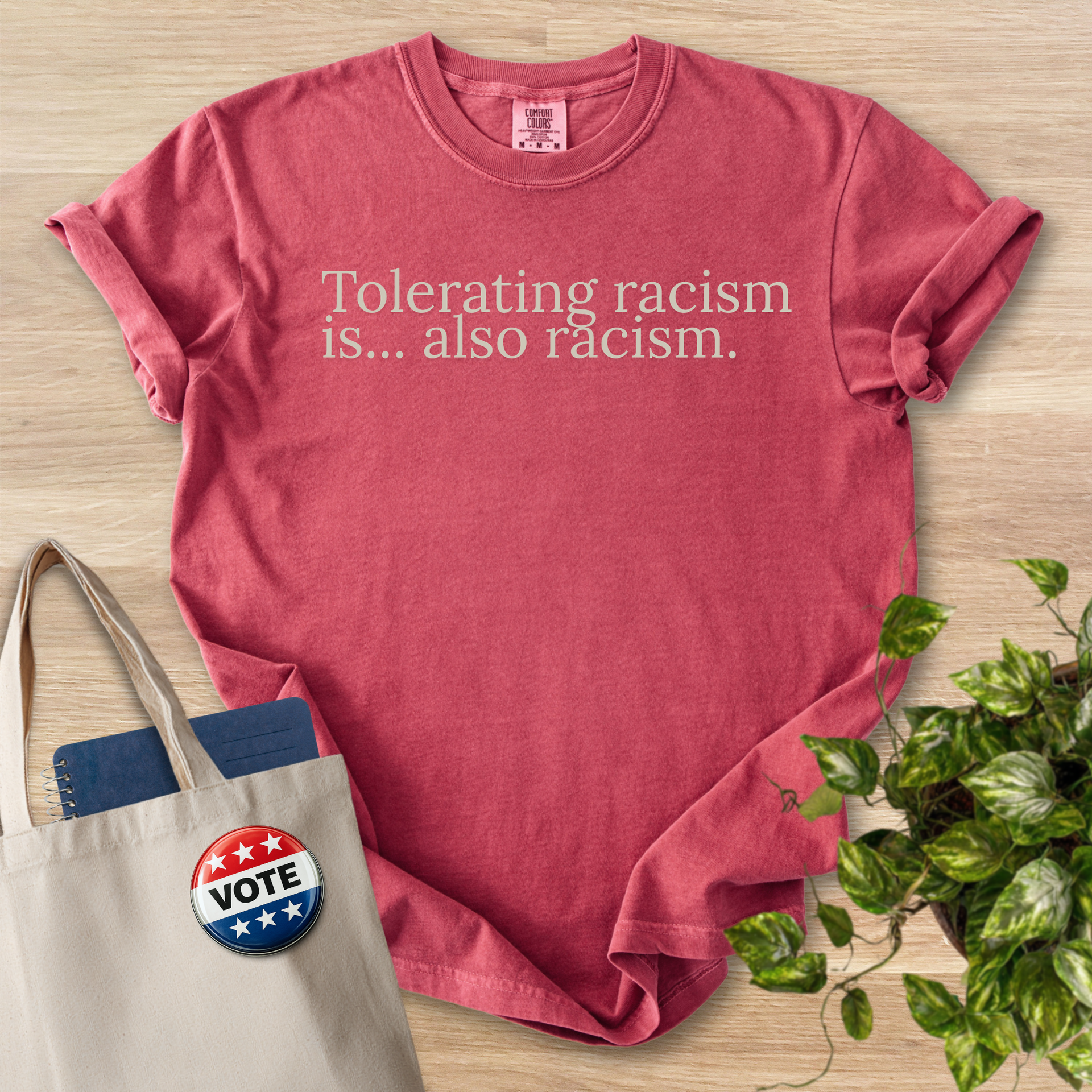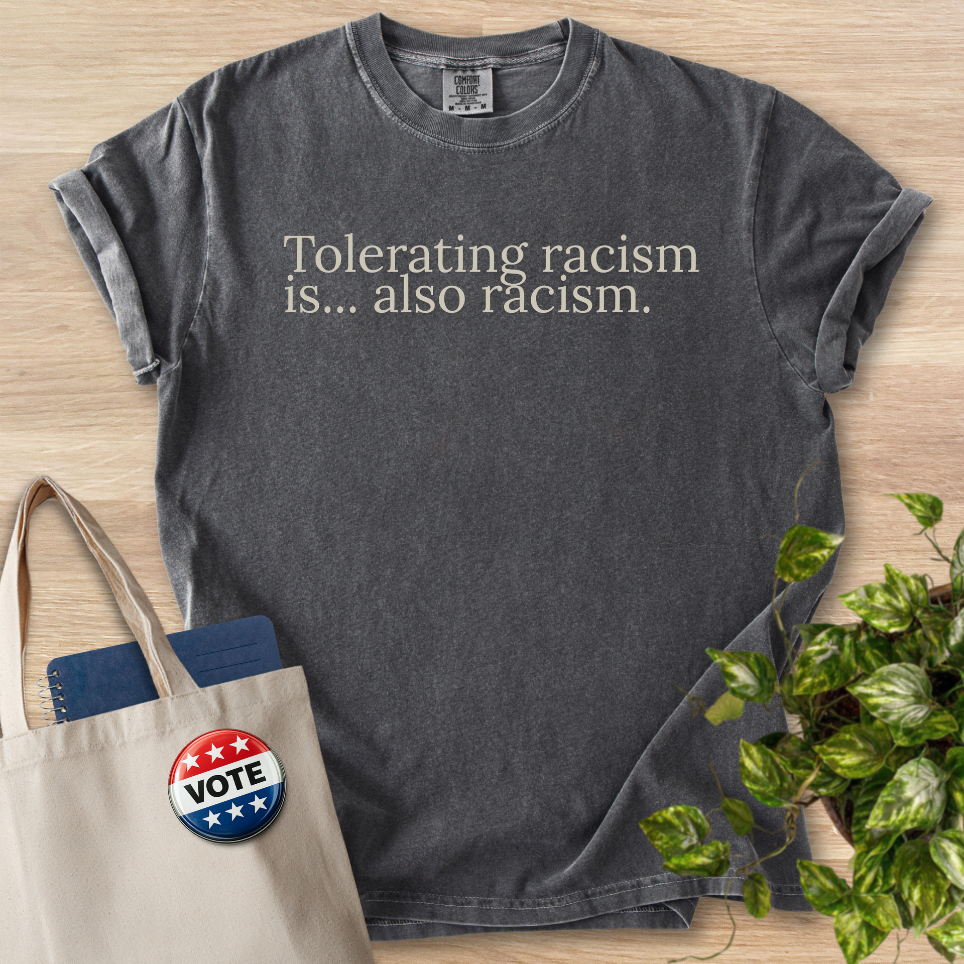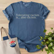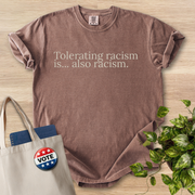 This heavyweight, garment-dyed tee speaks softly but clearly. The muted brown tone and understated serif text—"Tolerating racism is... also racism."—create a calm, steady presence that holds space for thoughtful conversations. Wear it to community meetings, teach-ins, or casual days when you want to express solidarity without shouting. The relaxed fit and soft, post-dye texture make it comfortable for long days of volunteering, commuting, or sitting in on a panel. It pairs easily with jeans, a worn jacket, or a tote filled with flyers and notes. For folks who show up to learn, listen, and act, this shirt is a quiet statement that invites reflection and dialogue.