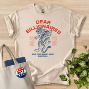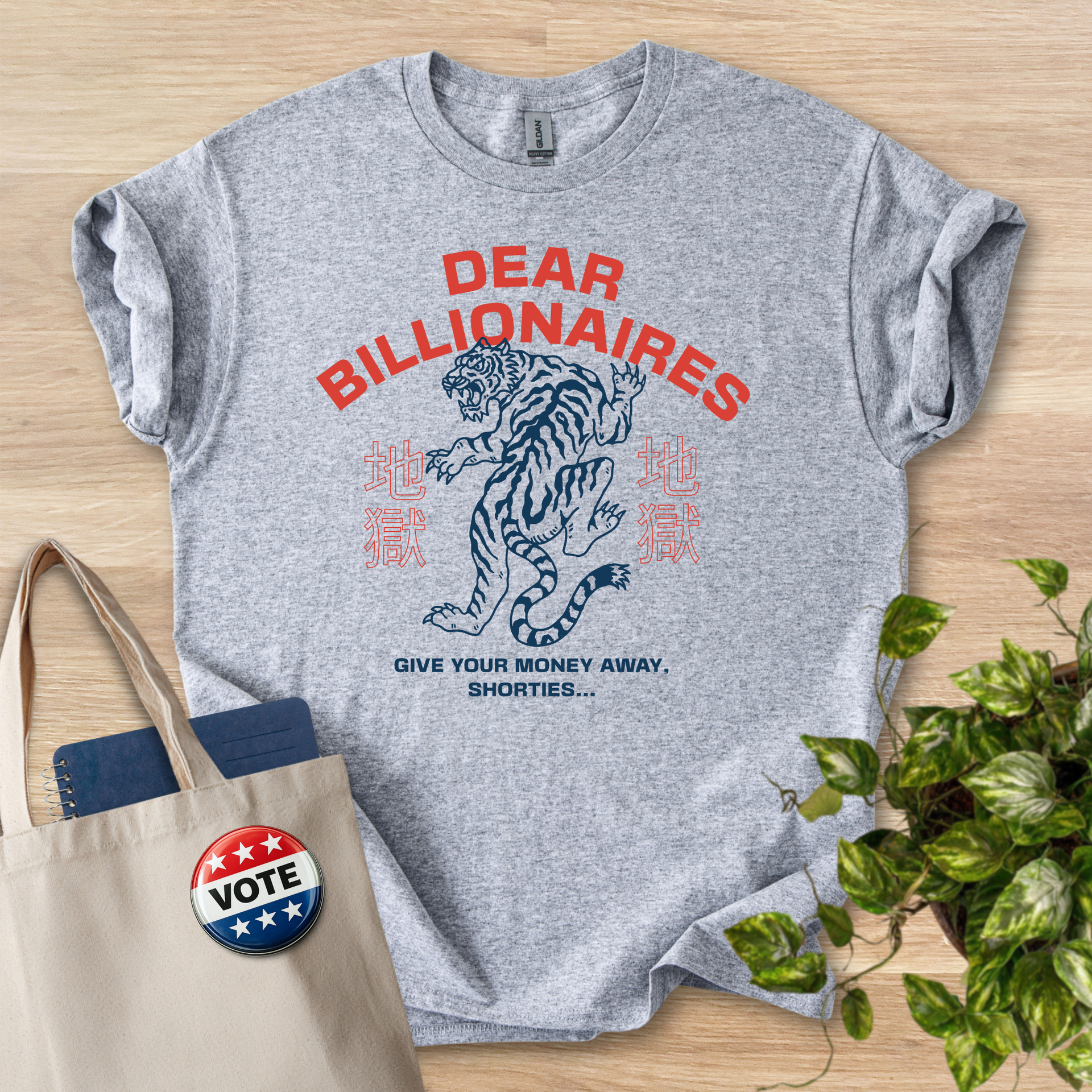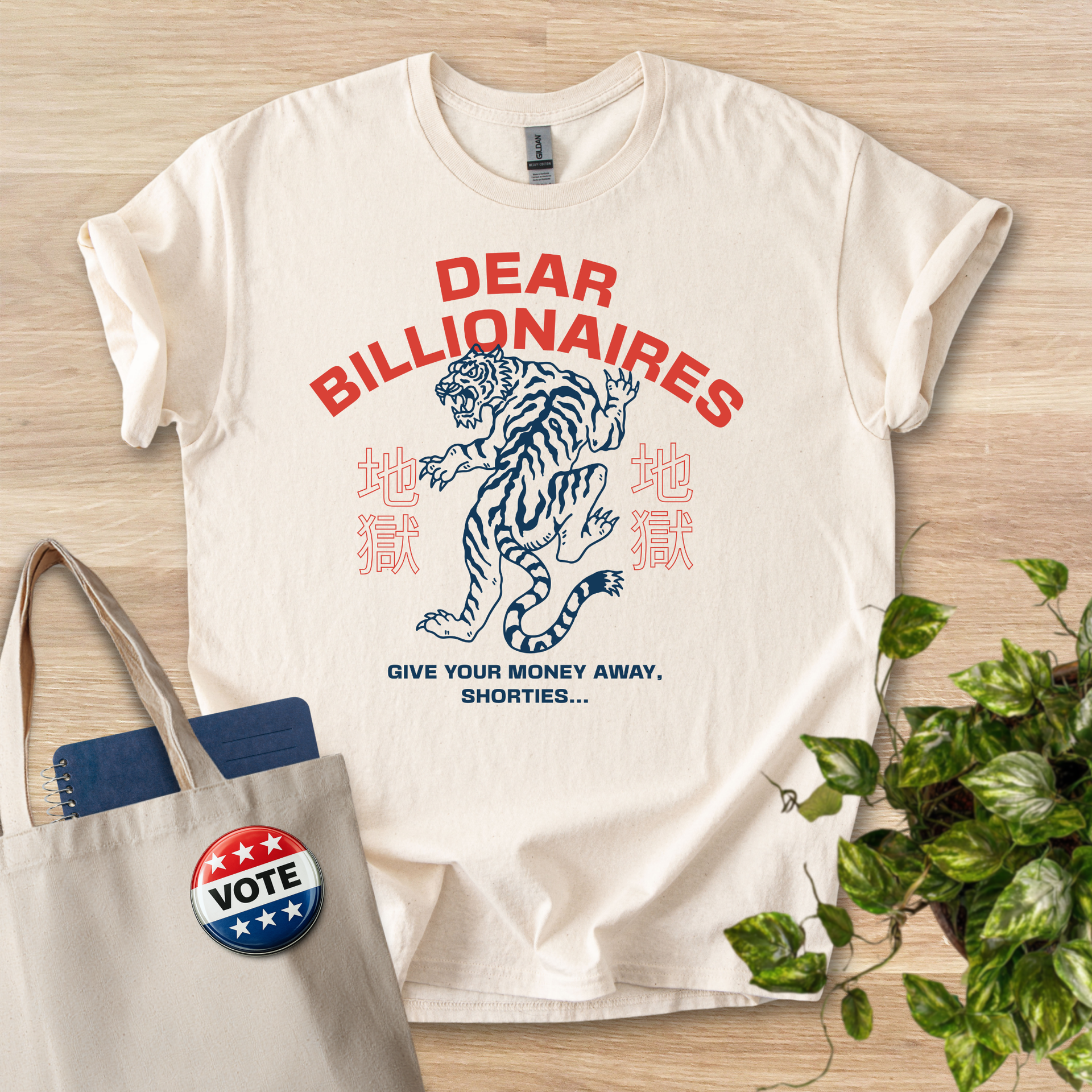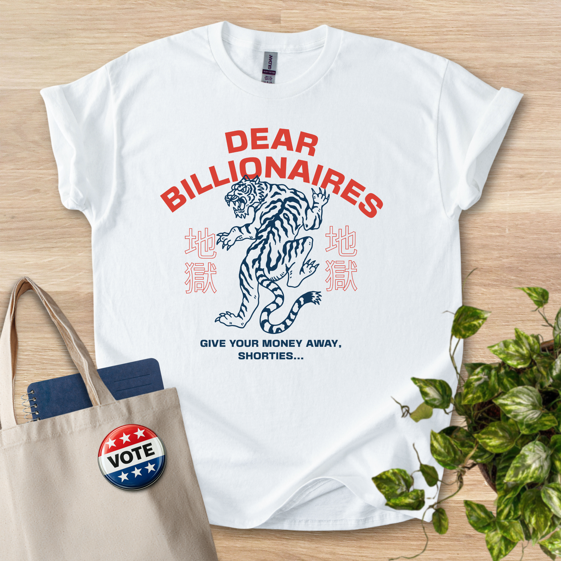 This relaxed crewneck tee carries a playful, rebellious energy — a crisp white canvas with a vintage-inspired tiger sketch and bold red headline that reads “DEAR BILLIONAIRES.” The design balances cheeky satire with subtle streetwear flair: faded accents and a hand-drawn feel give it a lived-in, analog look. Wear it to spark conversation at protests, weekend hangouts, or casual city walks. Lightweight yet sturdy cotton keeps the shirt breathable and easy to layer under jackets or over long sleeves. It sits comfortably on the shoulders and holds its shape through frequent wear, so the message stays as clear as your stance.