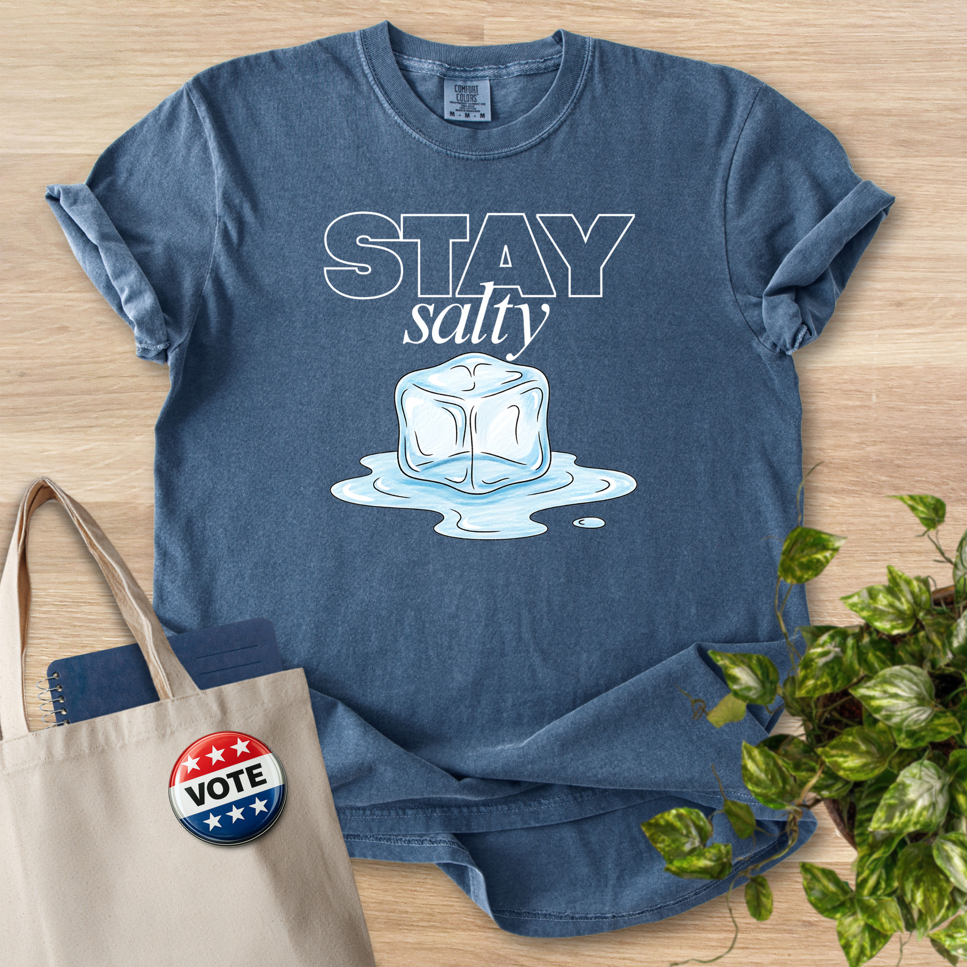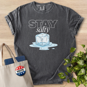 This relaxed, garment-dyed tee brings a salty, seaside attitude to everyday wear. The soft, washed-in color and heavyweight 100% ring-spun cotton feel broken-in from day one, while the playful “Stay Salty” ice-cube artwork sits centered on the chest as a cheeky nod to ocean days and chill nights. Cut for a roomy, comfortable fit with tubular construction and double-needle stitched seams, it moves easily with you and keeps its shape wash after wash. Wear it with faded denim or layered under a flannel for a casual beach-town look that reads effortless and lived-in.